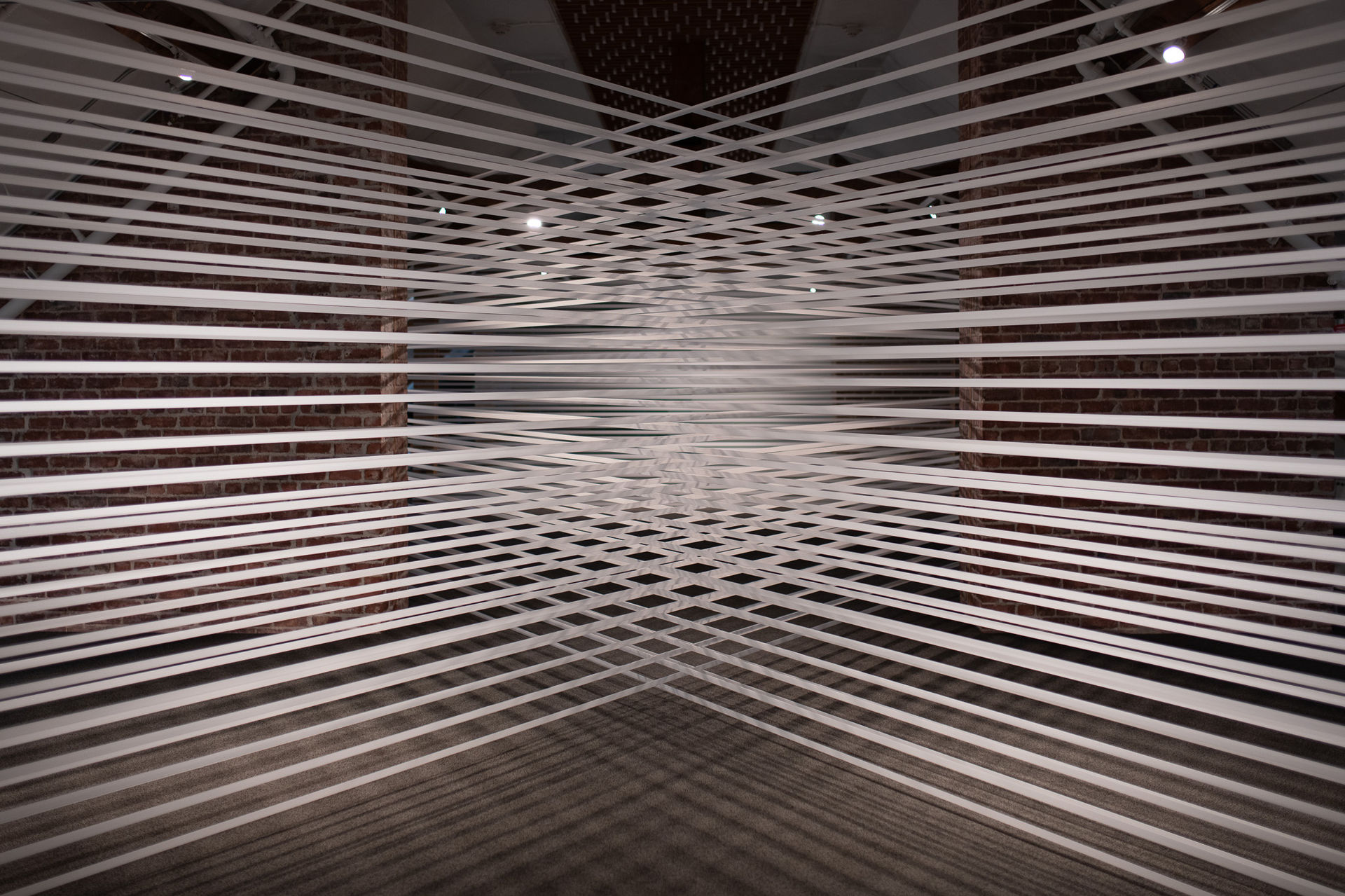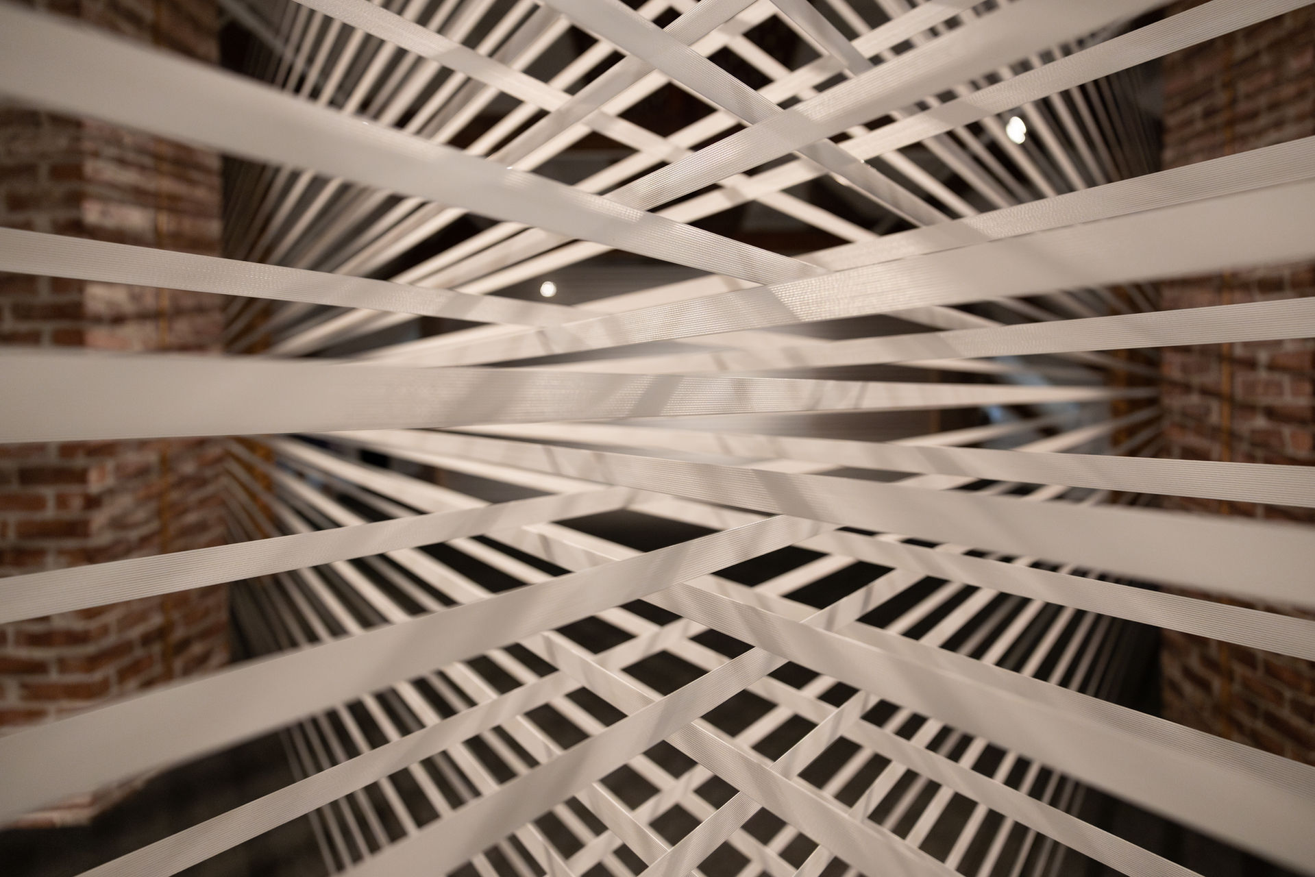 Presented at Stewart Hall Art Gallery in 2023, Déferlement–Breakaways was an immersive installation by Andréanne Abbondanza-Bergeron that transformed the gallery’s attic-like architecture into a flowing, spatial embodiment of water’s movement and force. Known for her interdisciplinary approach combining architecture and environmental concerns, Abbondanza-Bergeron used industrial polyester strapping—normally hidden in the logistics of global commerce—to evoke a deluge moving through and against structural boundaries. Suspended across beams and woven into the ceiling’s framework, the straps formed a shifting current that invited visitors to move through it physically, offering a direct bodily engagement with themes of natural flow, interruption, and resilience.